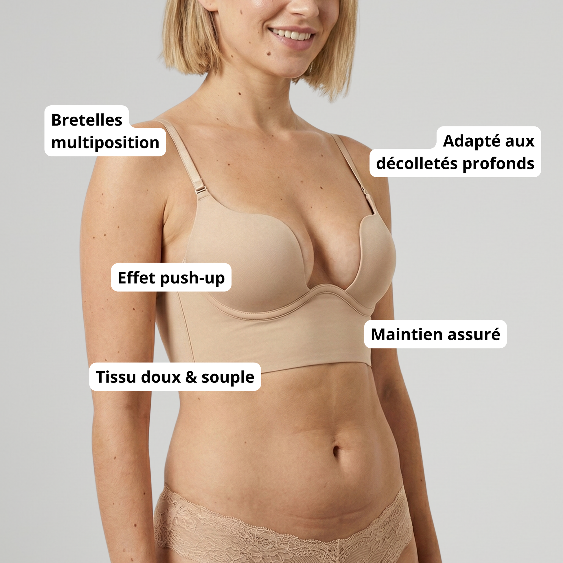 Ce modèle rehausse la poitrine grâce à son effet push-up, tout en offrant une attache ultra-basse idéale pour les dos nus et un décolleté profondément mis en avant.